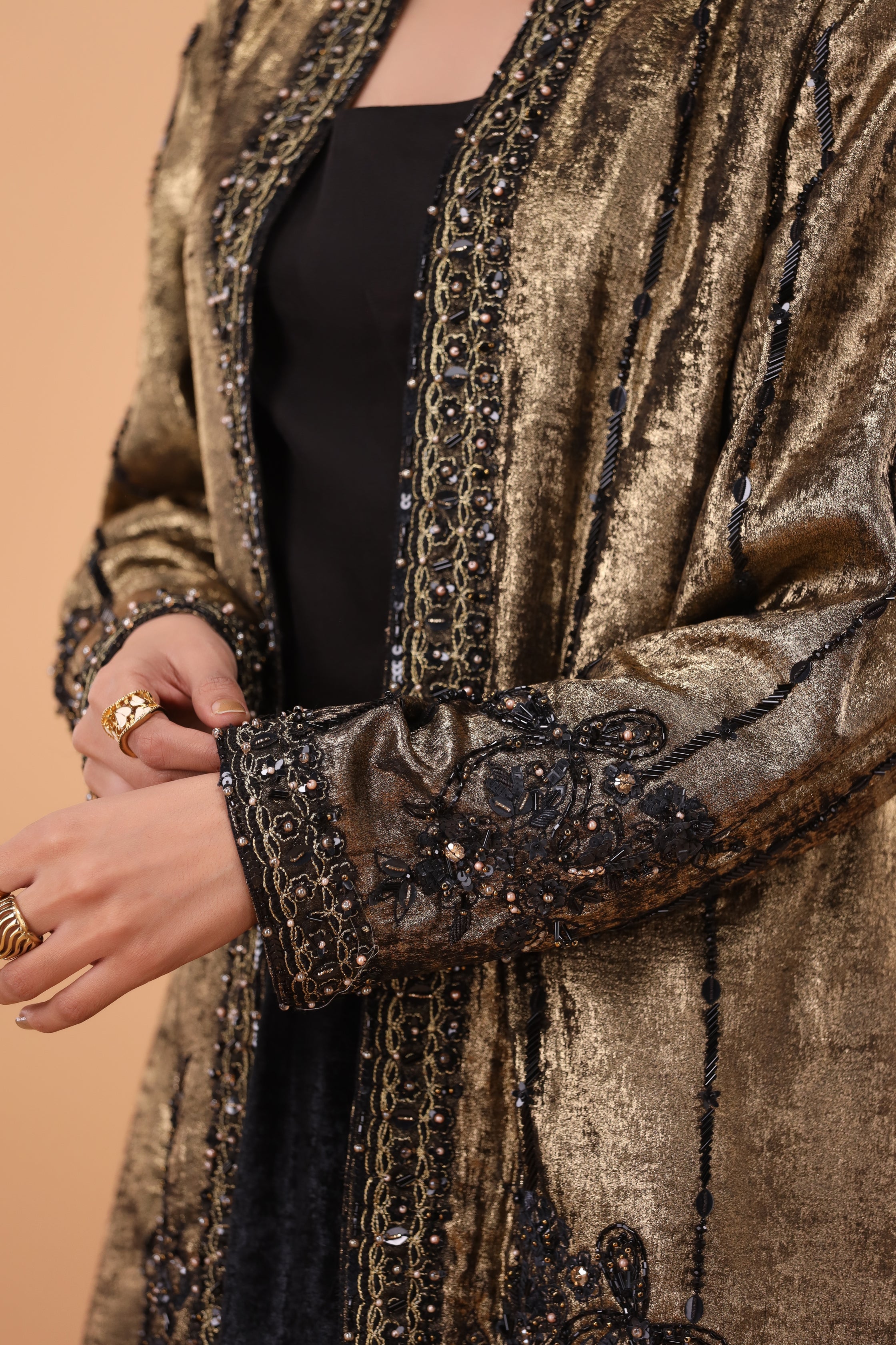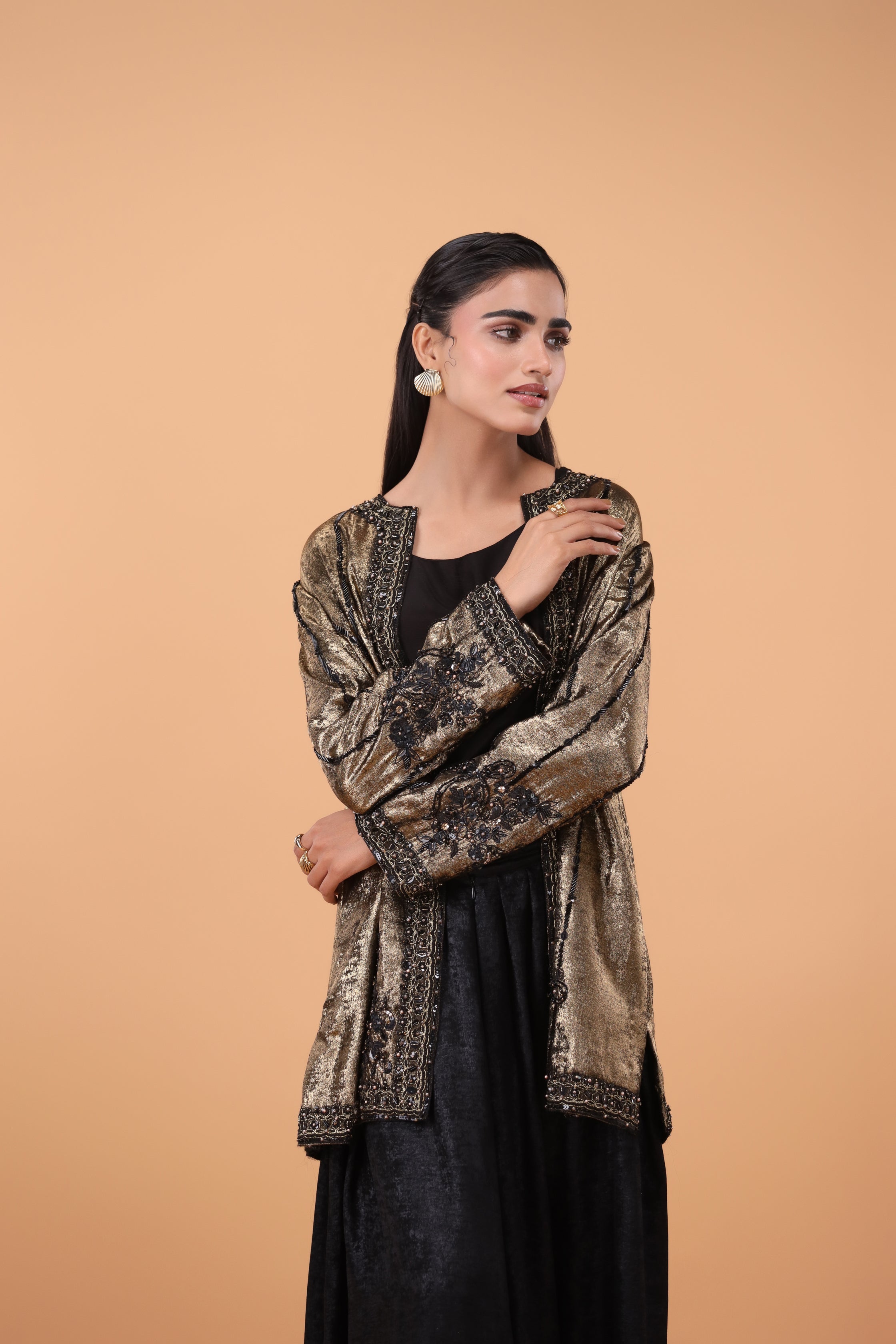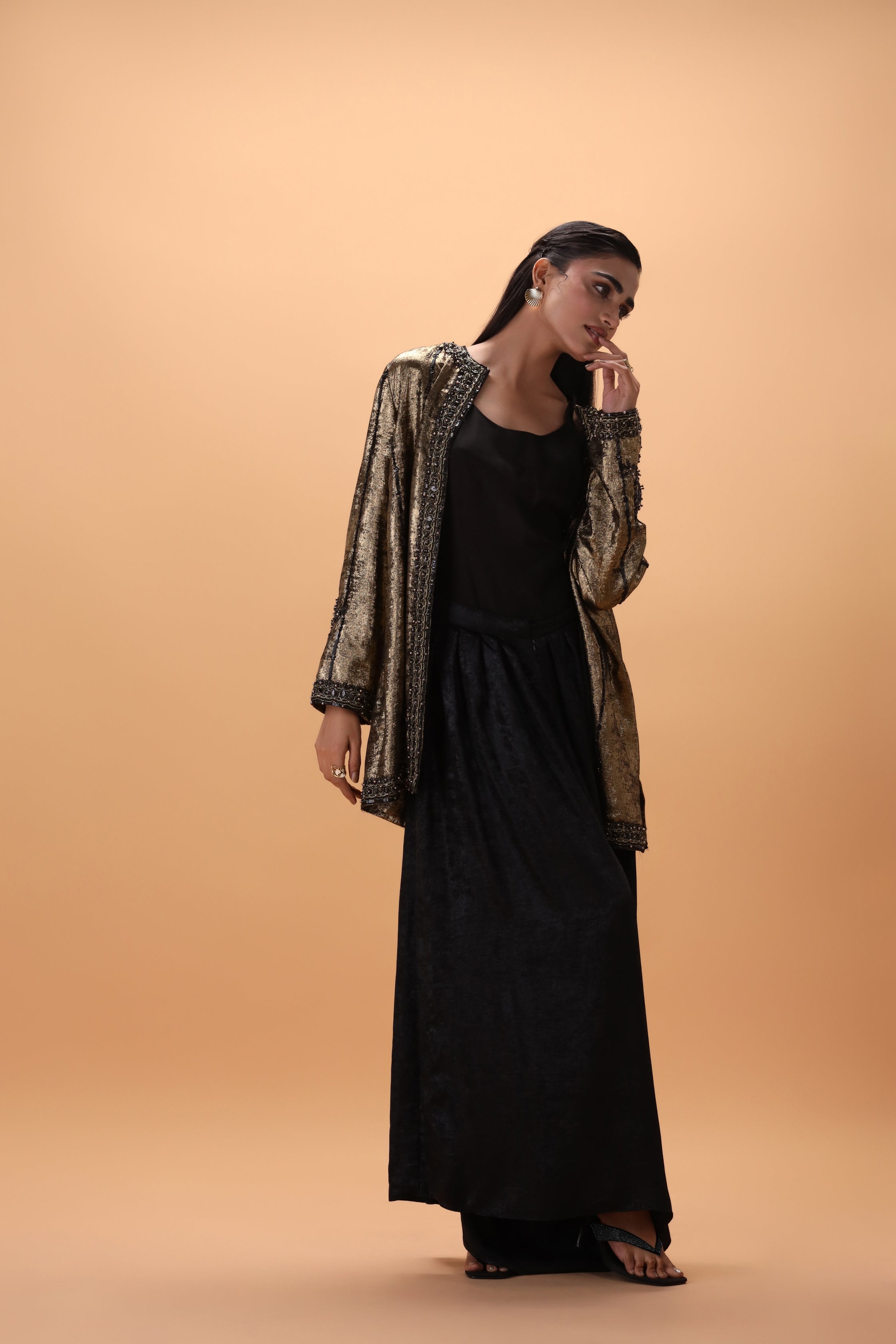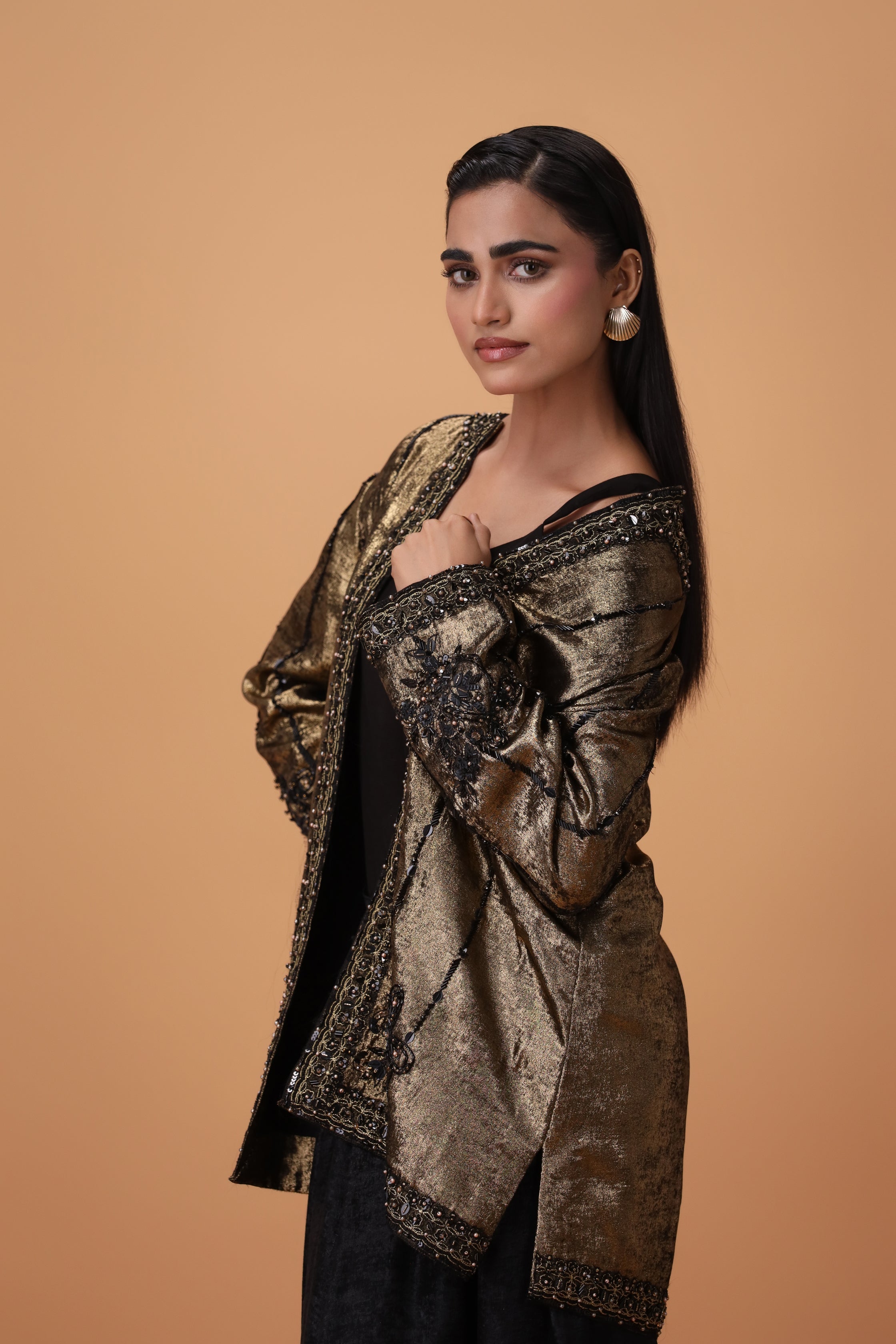 This eye-catching overlay is framed by intricate black beaded or zari borders along the lapel, cuffs, and hem, giving it structure and contrast, and is perfectly paired with refined black separates—Sleek raw silk inners. This ensemble offers luxurious, contemporary evening wear that can be styled together for a grand festive look or worn as separates, making the bold metallic jacket an essential statement piece for sophisticated semi-formal and formal gatherings.