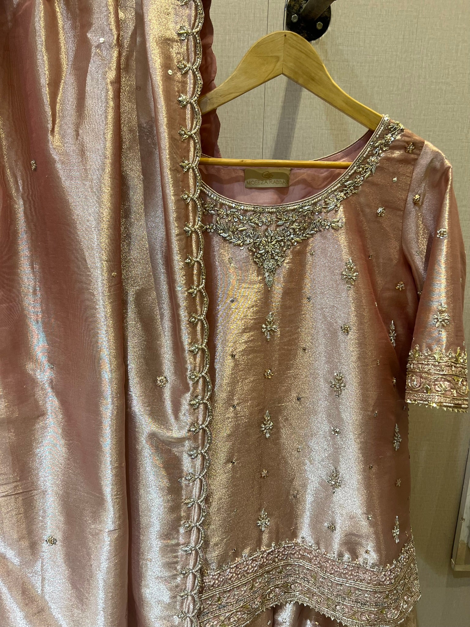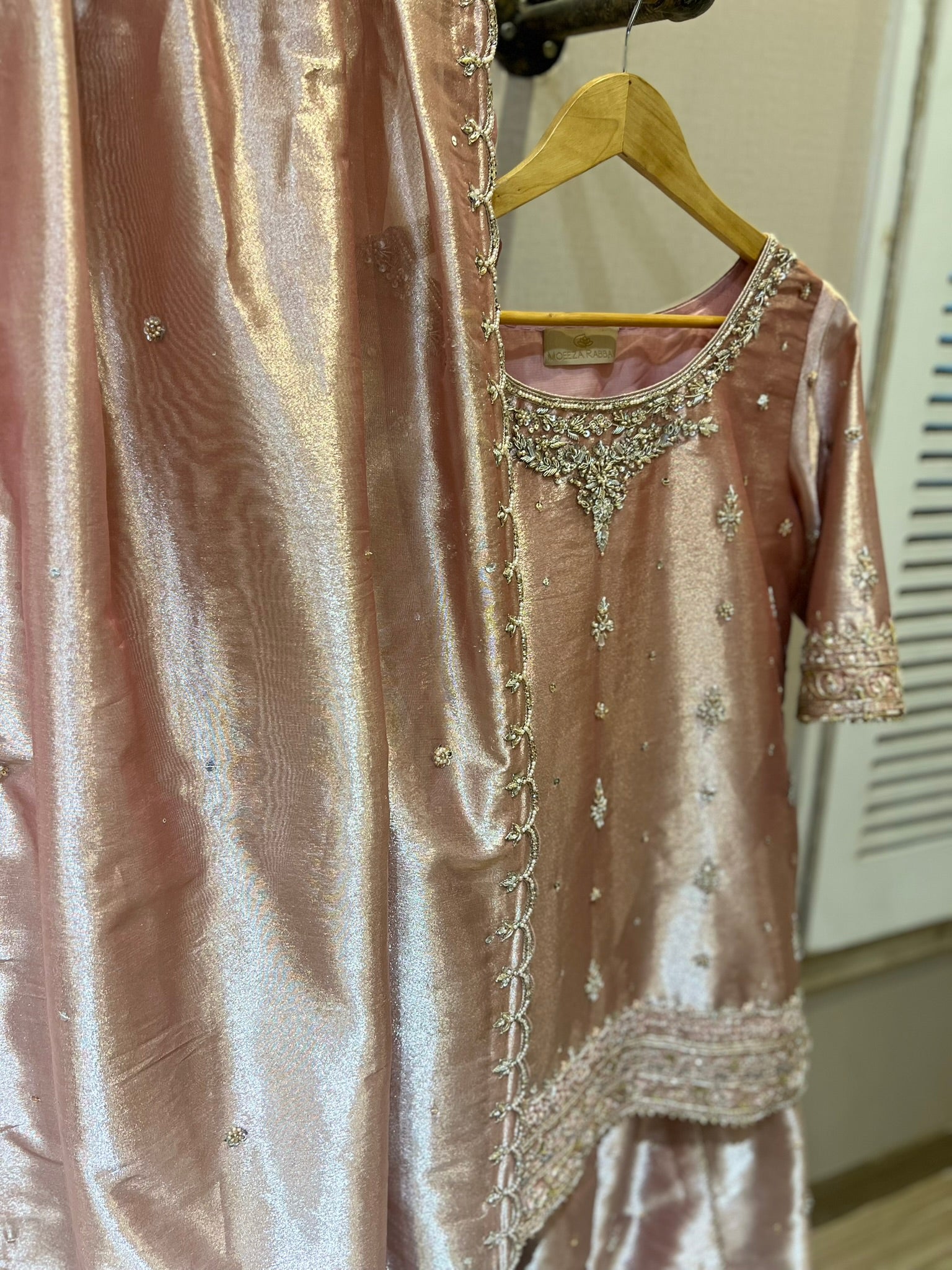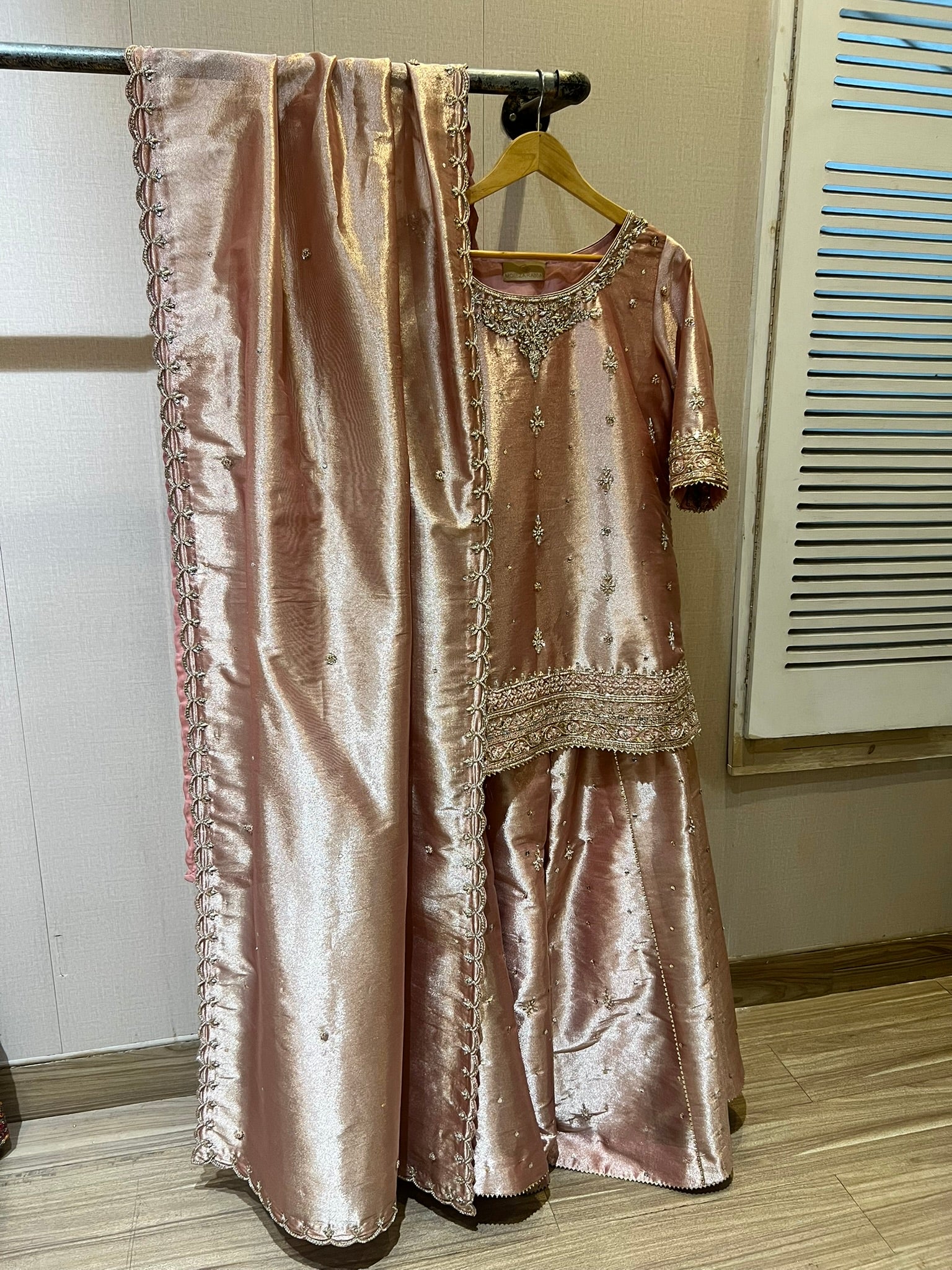 Tissue Shirt, Dupatta and sharara, with hand work and spray all over