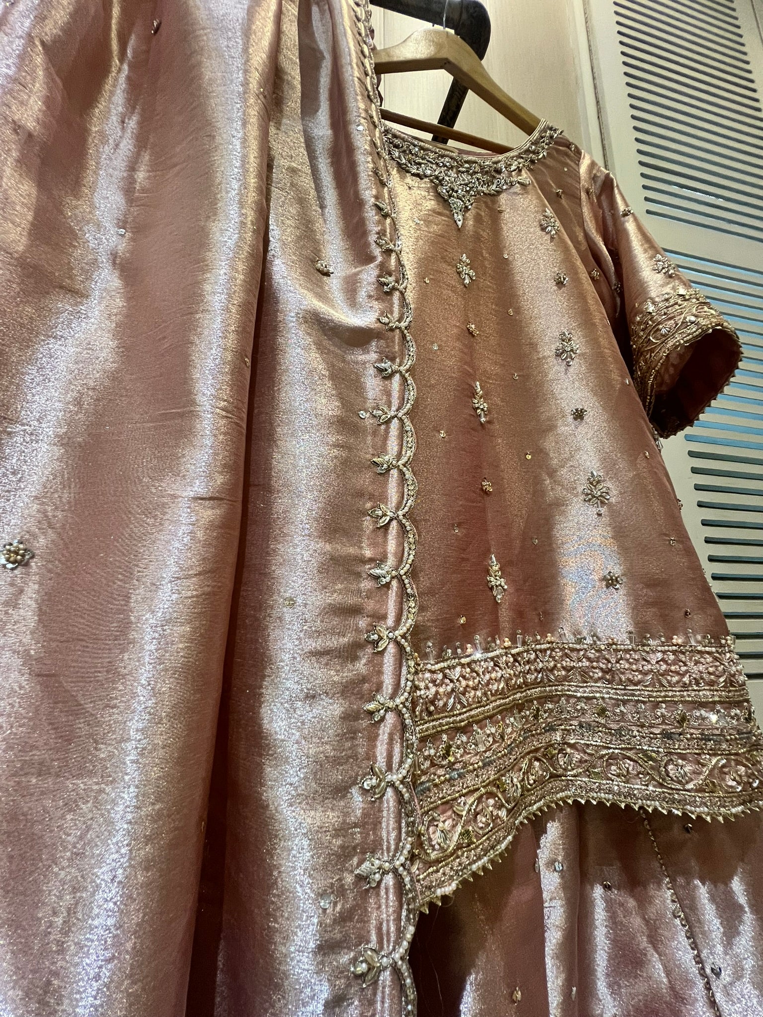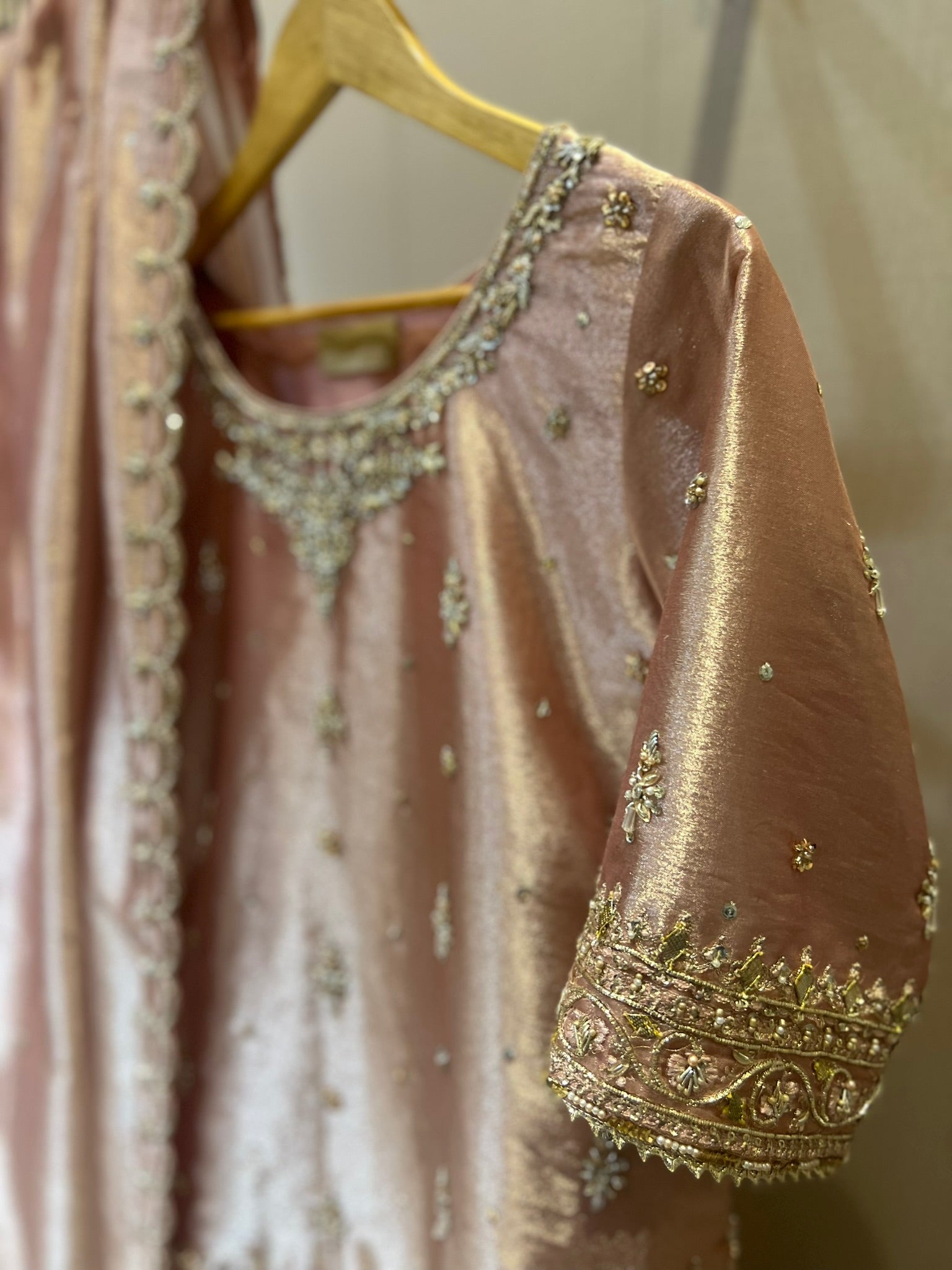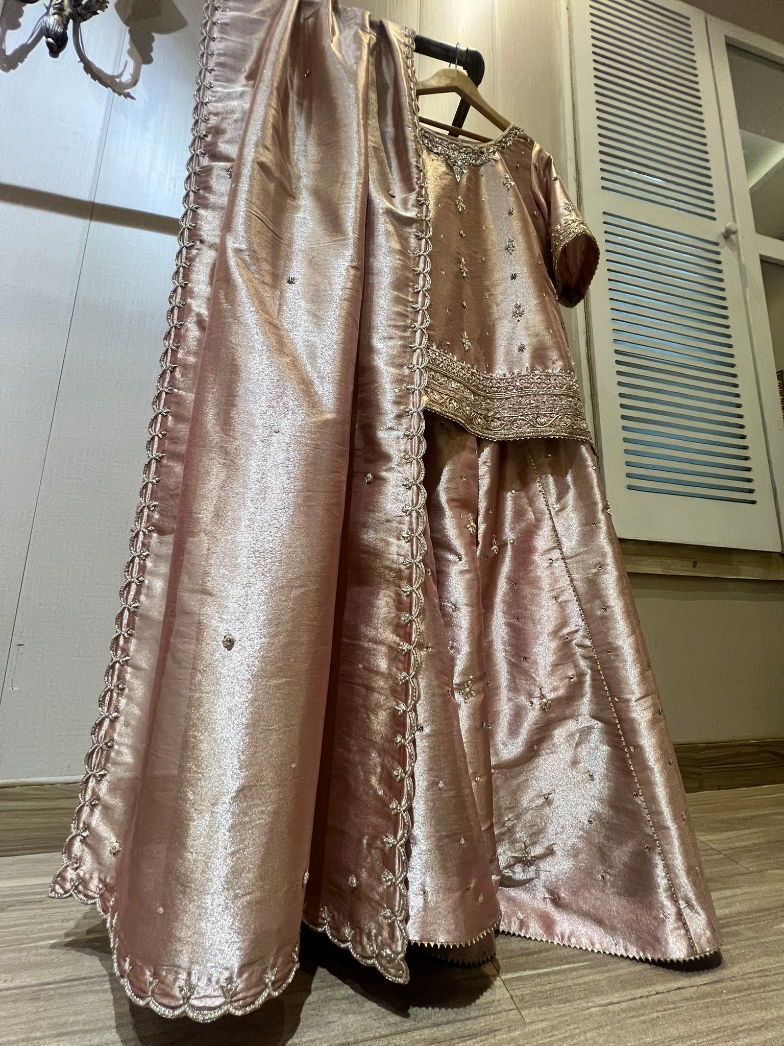 Tissue Shirt, Dupatta and sharara, with hand work and spray all over