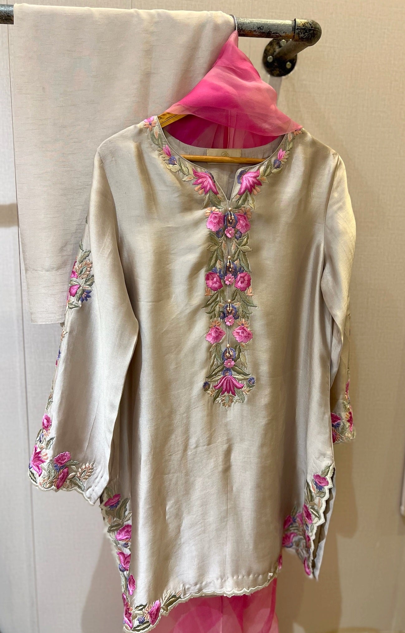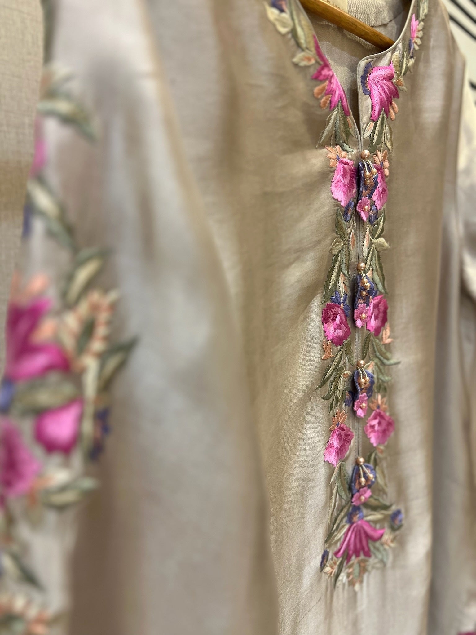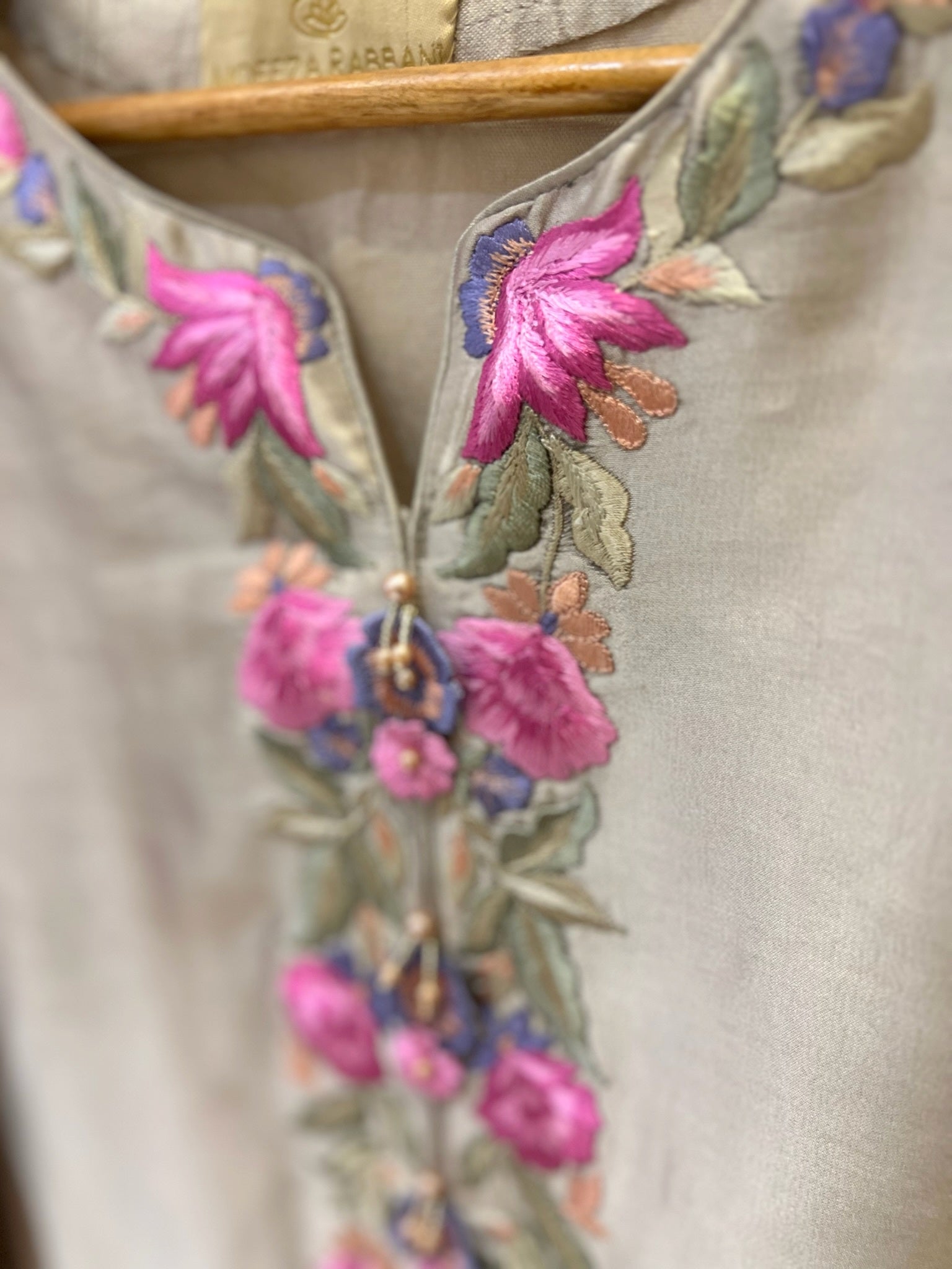 80 gram pure raw silk shirt with hand embroidery on the hem, front and sleeves
