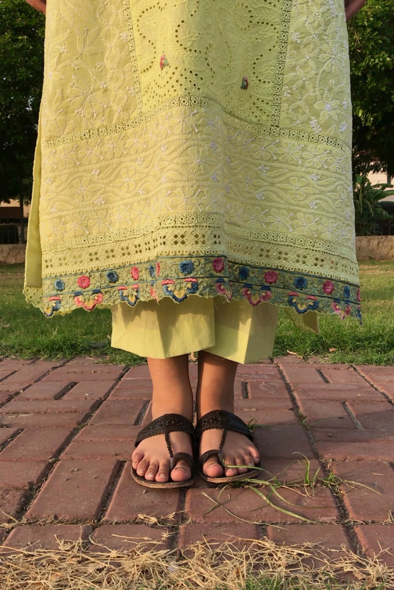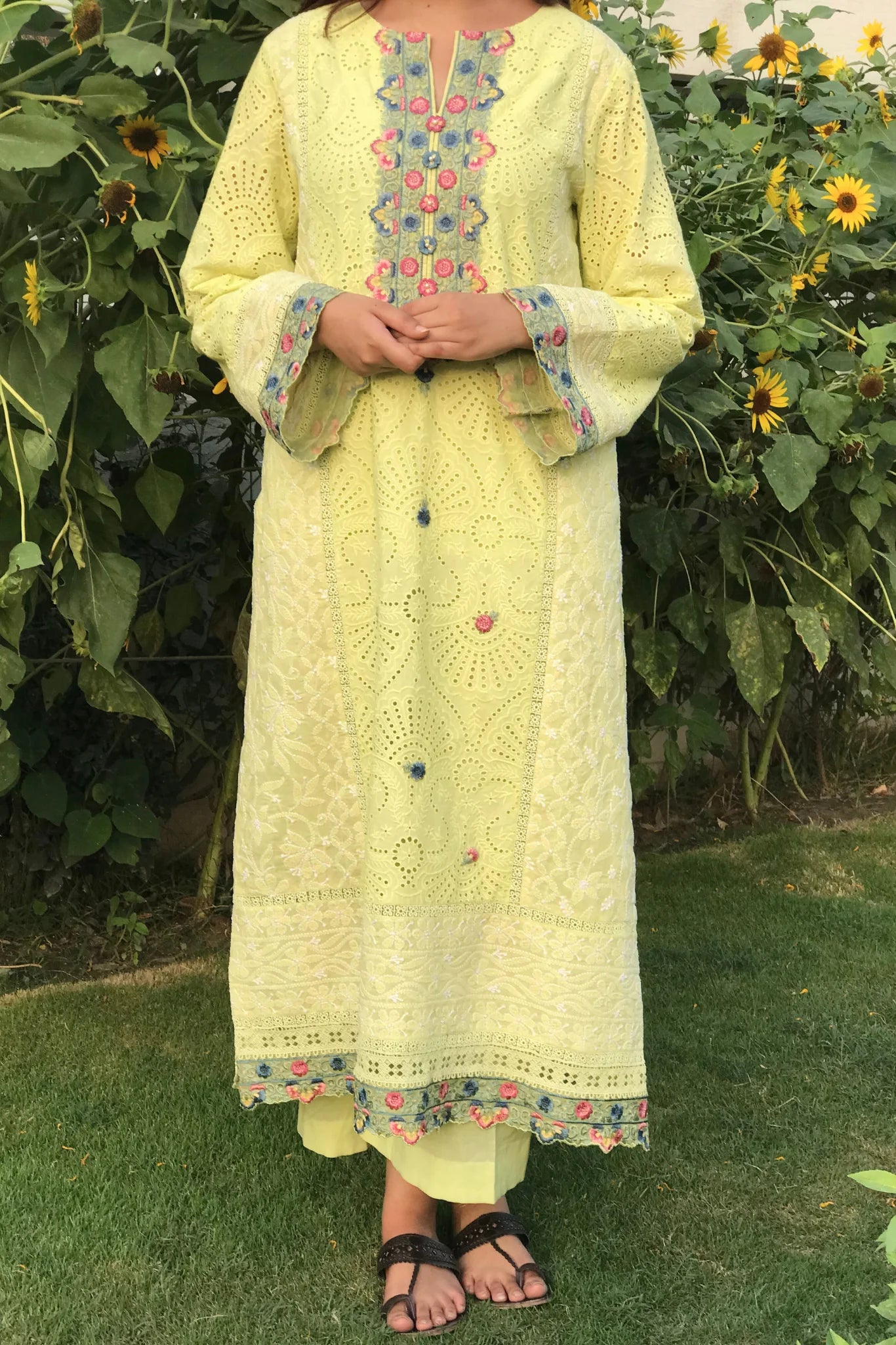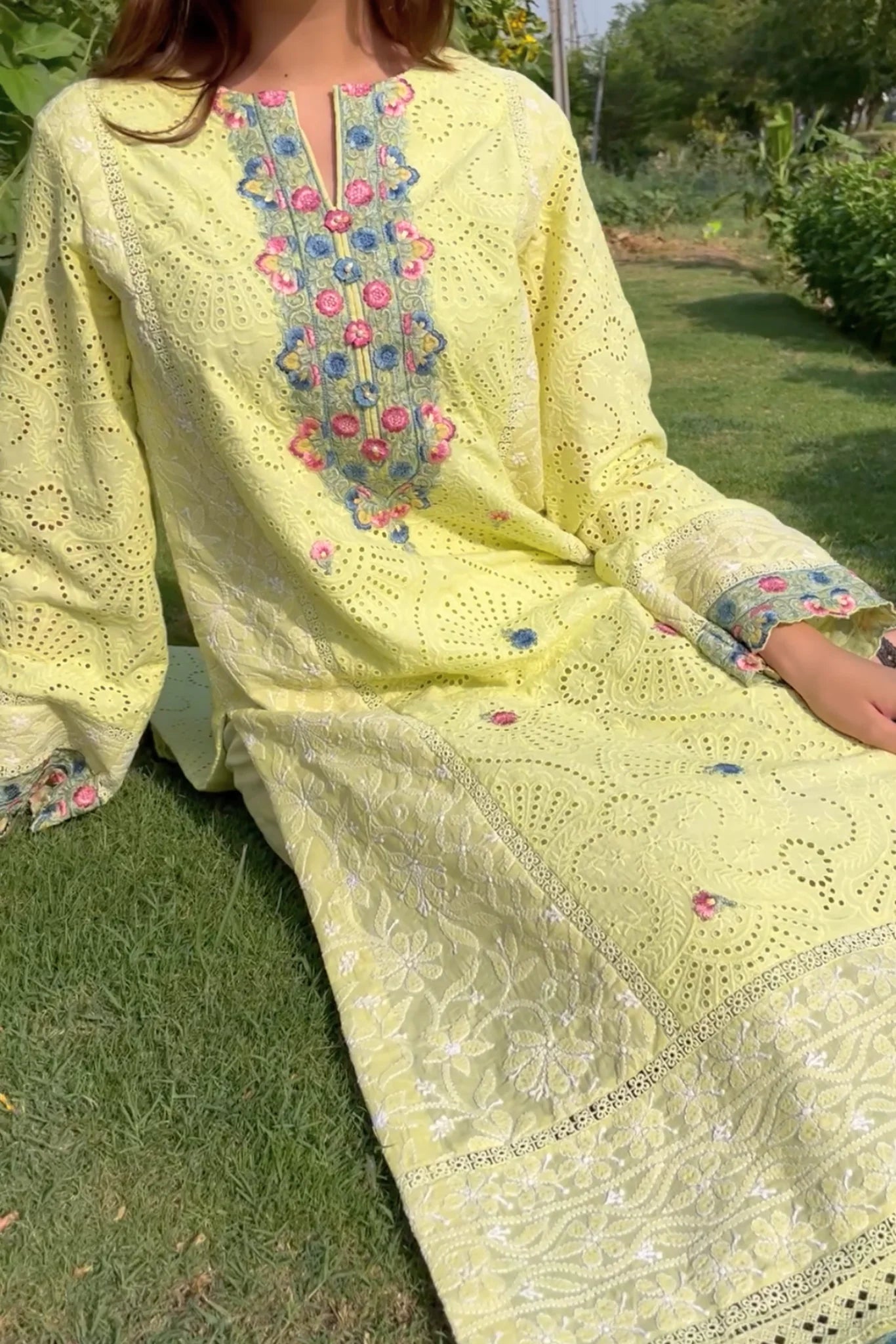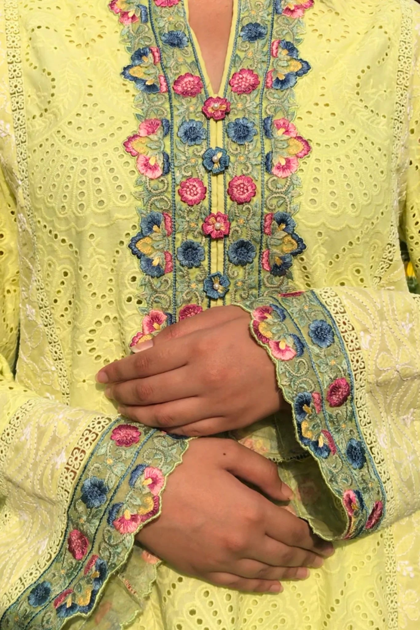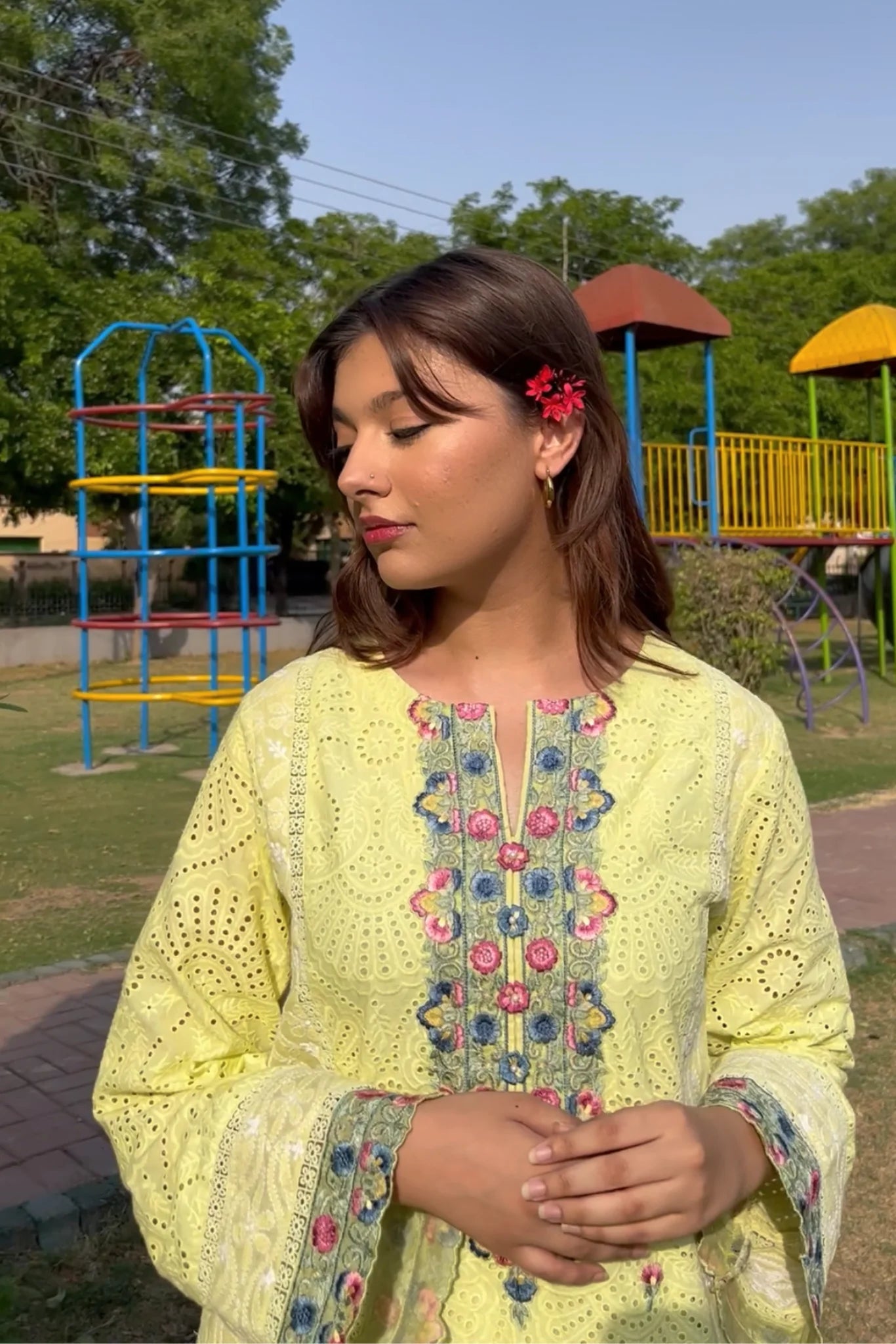 Description: Radiate summer charm in our Sunlit Blossom Kurta, a breezy pastel neon chicken kari eyelet shirt adorned with delicate floral embroidery in shades of rose pink, sky blue, and buttercream. The intricate threadwork on the neckline, sleeves, and hemline adds a whimsical pop of color, while the subtle lace detailing enhances its feminine grace. Perfect for daytime festivities or a casual garden soiree, this kurta promises effortless elegance with a touch of playfulness.